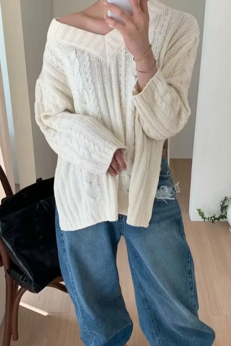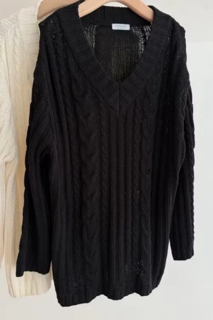 溫柔麻花大開衩V領毛衣