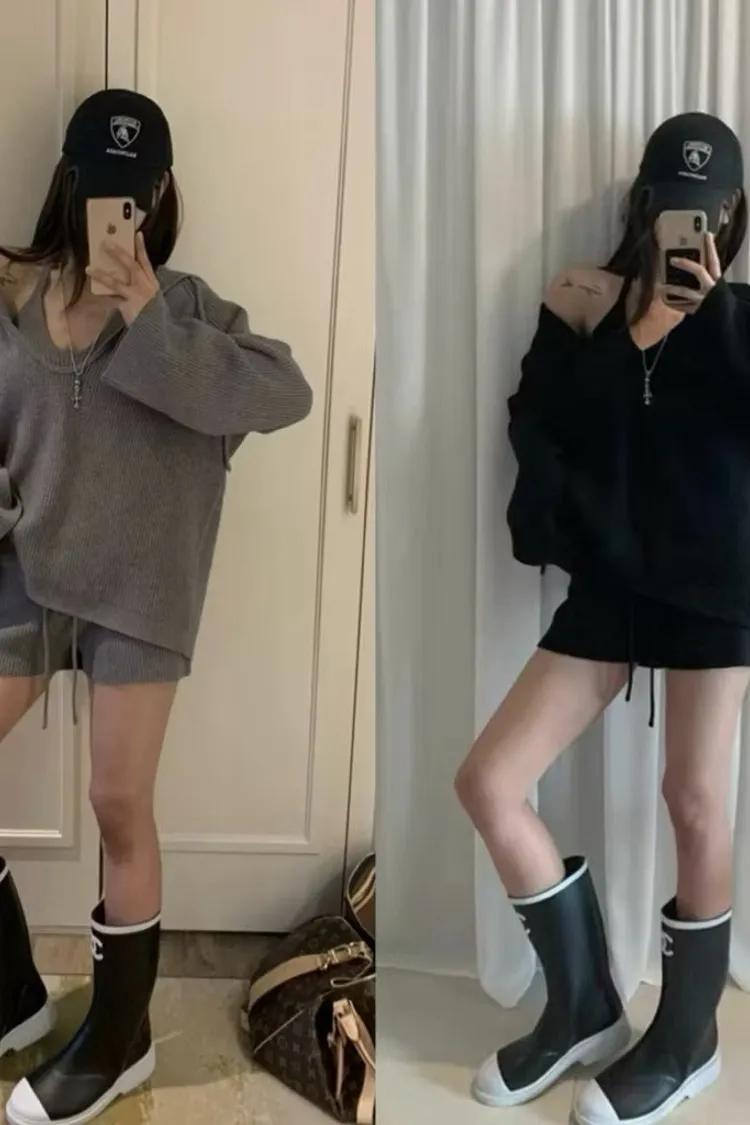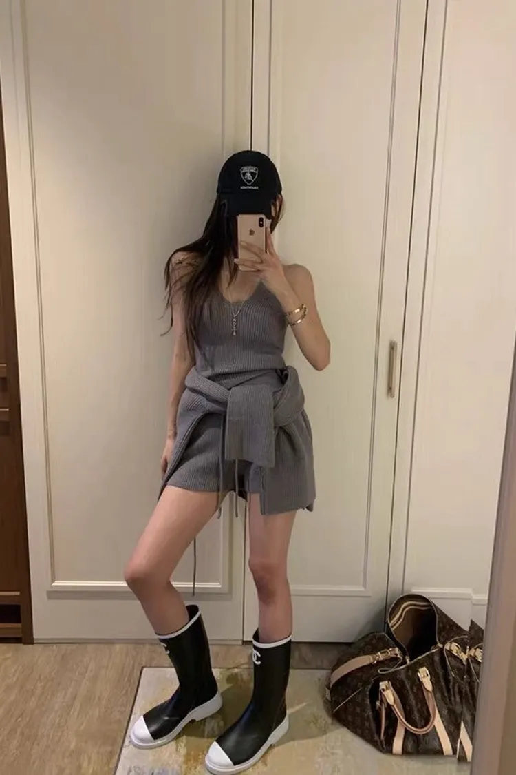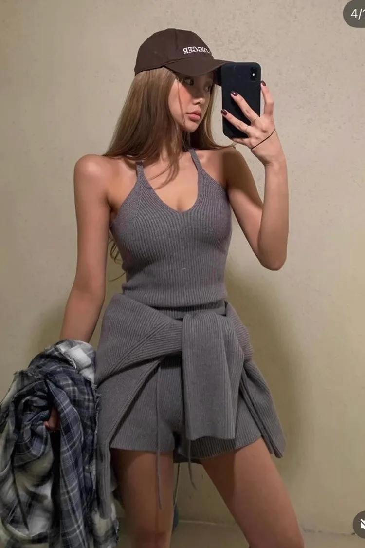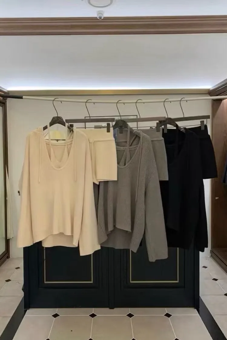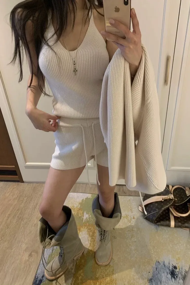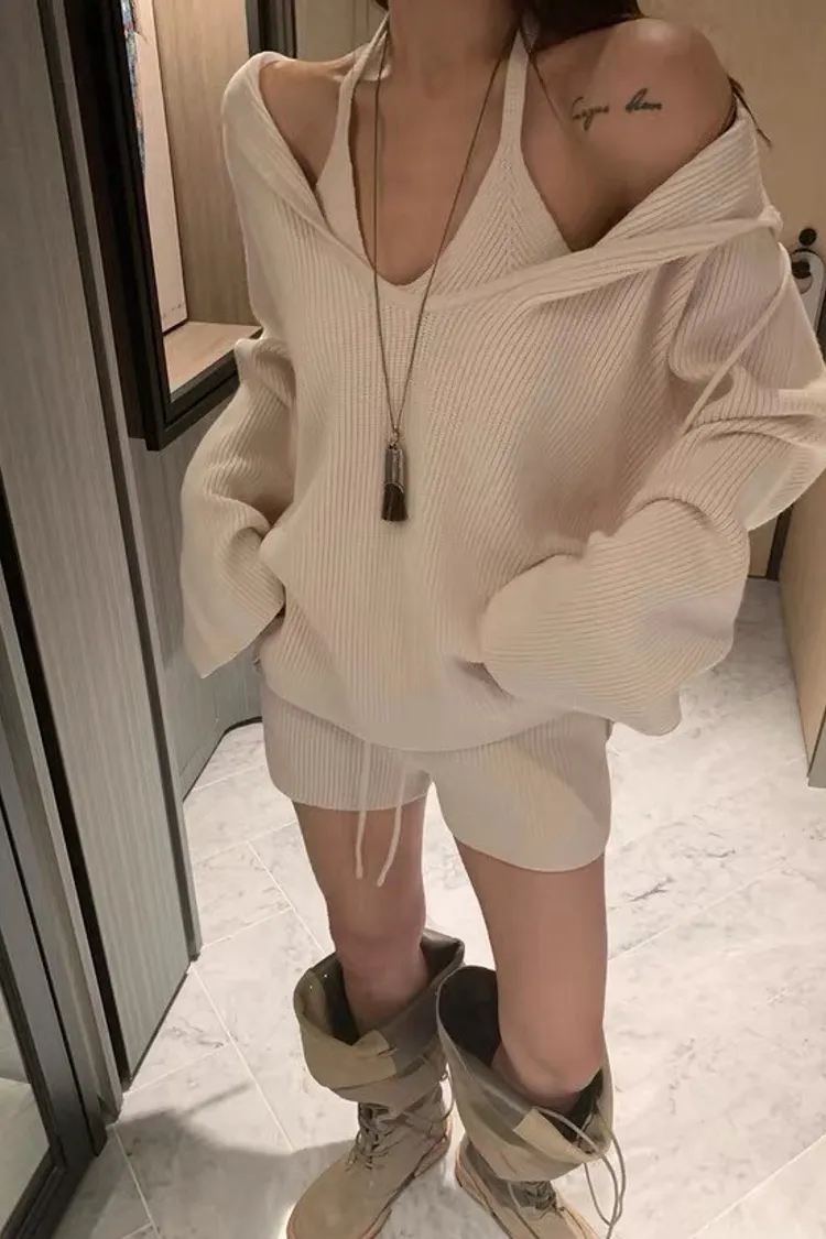 簡約針織連帽寬領上衣+繞頸背心+短褲