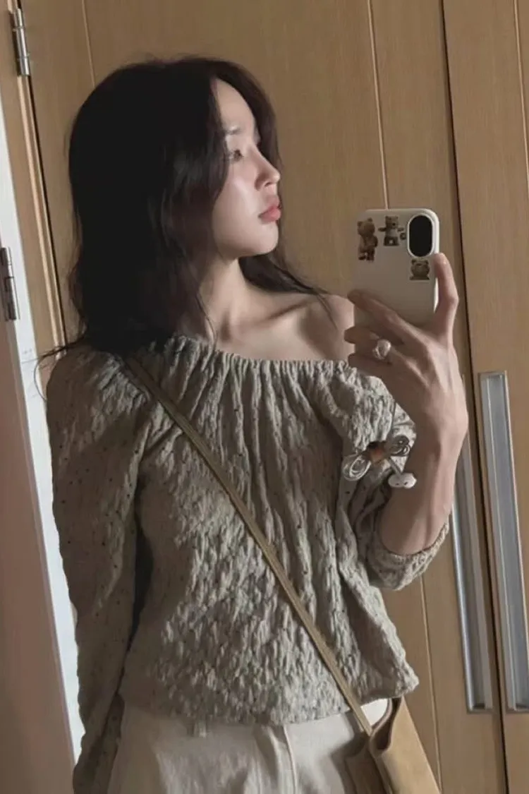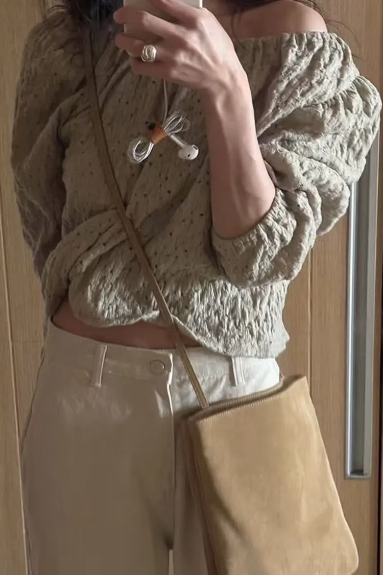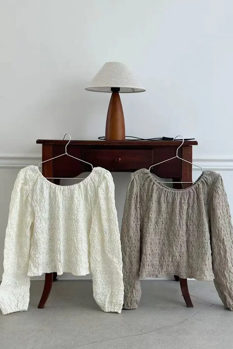 空氣感紋理織紋布料/領口鬆緊/一字領剪裁